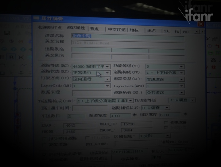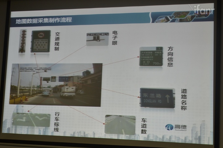 数据采集可以分为车辆采集,步行采集,企业用户,互联网采集,航空摄影测量及卫星影像,呼叫中心。目前高德有“几十辆”数据采集车跑在地面上,每辆车配备 3 人:1 名司机,2 名数据收集员。采集车上的摄像头由人工控制,需要采集的道路信息包括:交通规则,电子眼,方向信息,道路名称,车道数,行车标线等(如下图)。这些采集后的数据并不实时处理,而是带回数据基地由“内业”人员编辑处理。根据目测,采集车录制的视频接近 720P;对于爱范儿的提问,参观过程随行的易雪峰没有正面回答,只是说“比相机的差一些”。
