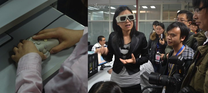 地图数据处理的术语中有一个叫“背景”,是指除了道路和建筑之外的山、河、湖、水等“为导航作作背景衬托”的物体。与“背景部”同处四层的还有“星天地”部门,即制作三维地图产品的部门。与 3D 电影的双机位一样,3D 地图也是由两张 2D 图片叠加处理生成,如果不戴 3D 眼镜则有重影。下图中,制作 3D 地图的工作使用的鼠标也是 3D 的,右侧是 3D 测试眼镜。