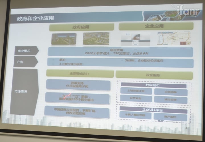 在沟通会快结束的时候,易雪峰谈到高德的优势:高德是互联网企业中的地图数据服务提供商,地图服务商中的互联网企业。回过头来看,成从武带领高德从 2010 年开始布局移动互联网战略,虽然当时看来“有点早”,却也让高德得以“春江水暖鸭先知”。在车载市场和前装市场,高德慢慢赶上原先最大的竞争对手四维图新,根据 2011 年年报,高德来自汽车导航业务的收入已经达到 5.5 亿元,领先四维图新半个身位;而 10 月底传出凯立德 IPO 计划流产的消息,高德在导航类软件中的最大劲敌可能迎来资金瓶颈,未来一段时期内阻碍其发展。对于上市公司高德来说,这无疑是一大利好消息。