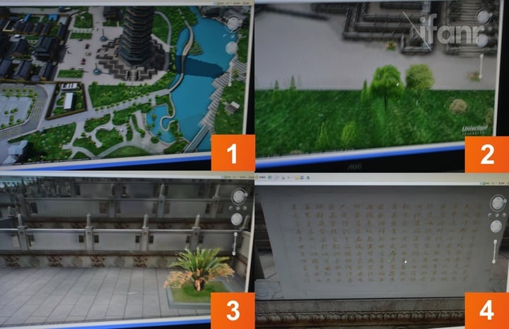在为政府的服务中,高德 3D 地图模型已经做到了厘米级别的清晰度。在演示杭州西湖一座寺塔的 3D 模型图时,镜头可以迅速地从寺塔远景切换到寺塔上的碑文。如下图。