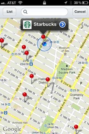 打开 Square Wallet,进入“目录(directory)”可发现附近的星巴克都在地图上用“大头钉”标记了出来,比其它 Square 合作的商店拥有更高的优先级。在应用的地图中,星巴克单独成为一个列表——换言之,在地图上浏览星巴克店面时,也能方便地找到其它与 Square 合作的商家。