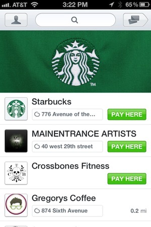 到底如何用 Square Wallet 支付购买一杯咖啡的钱?方法很简单。你可以在列表中选择一家星巴克,然后点击“Pay Here”。