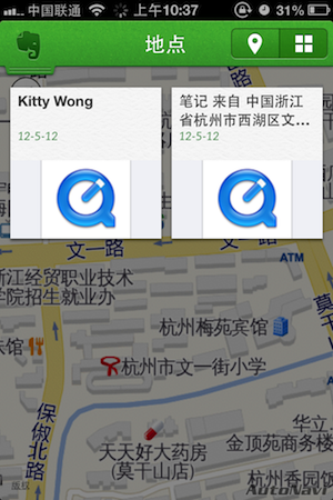 点开“地点”标签页,会显示一张地图,上面放置了大头钉,标记你记录笔记时的位置,同时大头钉还会显示笔记的数目,如果点击大头钉,会显示一则相关在该地点记录的笔记,但比较容易引起误操作,变成放大地图而不是查看笔记。如果点击右上角的按钮,便可从地点视图切换为笔记清单,让你知道在这个地点附近做过那些笔记。如果直接点击一则笔记那么会直接进入编辑页面,直接进行编辑。