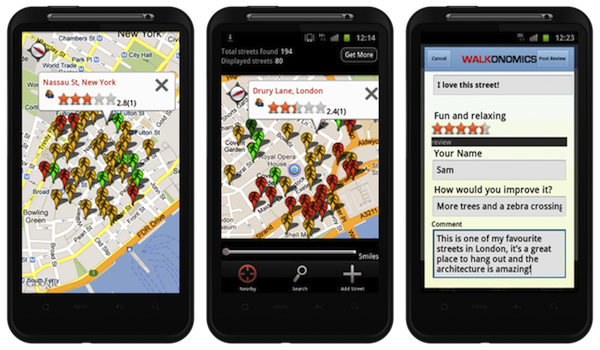 除了网站以外,Walknomics 还推出了 Android 应用——通过手机地理定位,你可以方便地查询附近哪条街道更适合散步,也可以更方便打分,甚至上传街道的照片。对于 Walknomics 而言,手机应用也有利于他们积累更多数据。