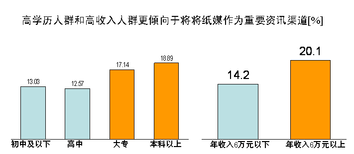 而受过高等教育和年收入 6 万元以上用户群体,比其他群体更倾向于选择报刊杂志作为新闻和资讯的重要获取渠道。