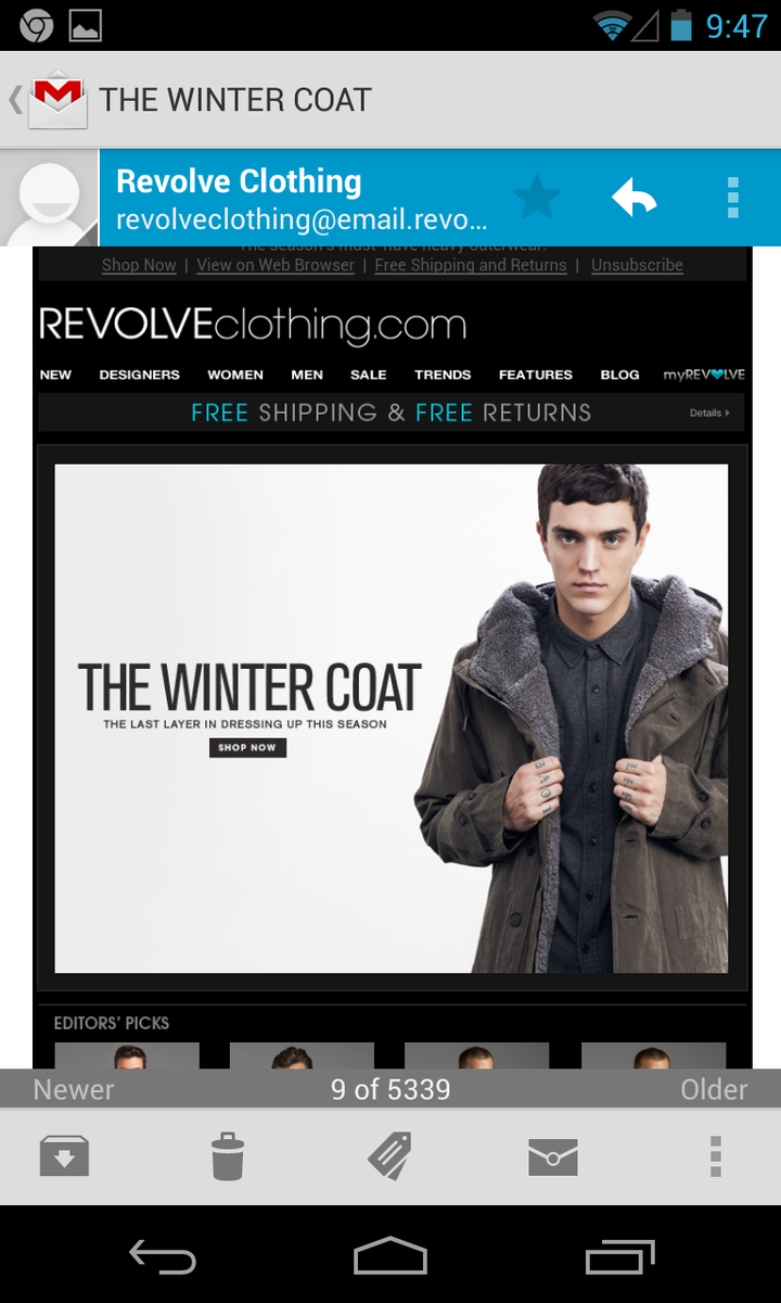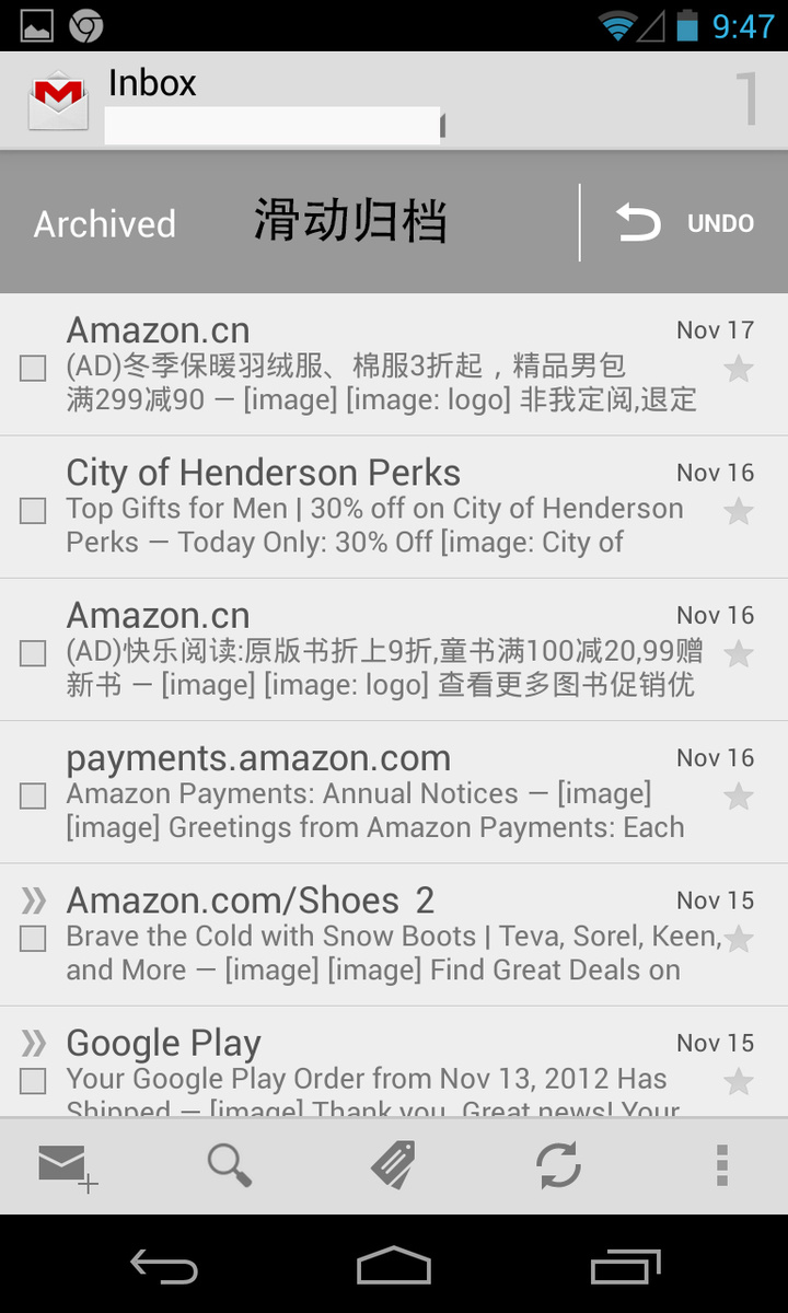 最新版本 Gmail 加入了自适应屏幕缩放的功能(默认未开启,见左下),总体体验不错,邮件正文页的图文排版上勉强赶上了 iOS。不过 Sparrow 团队的并入似乎还没给 Gmail 应用的界面带来新气象,程序界面仍显得实用有余,精致不足。当然,这不妨碍 Android 上的 Gmail 立足于全平台邮件客户端之首,类桌面端的用户体验(账户管理、标签管理等)和及时推送是它成功的要诀。