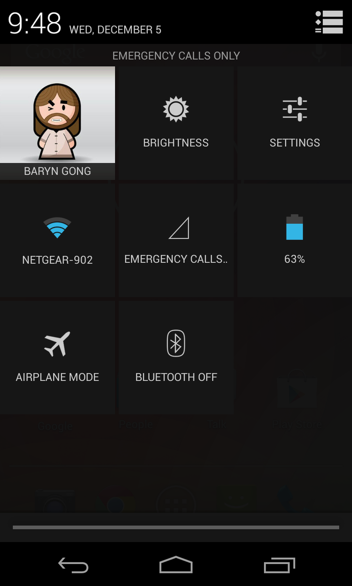 Android 4.2 下拉通知单做了改进,单指下拉呼出通知栏,双指下拉呼出快捷控制菜单(双指手势判定很严格,必须双指手势同时到位下拉,上下略有错位会导致判定为单指下拉)。我不清楚 Google 引入双指手势的含义,原本一次下拉就能解决的事情偏要分两步走?