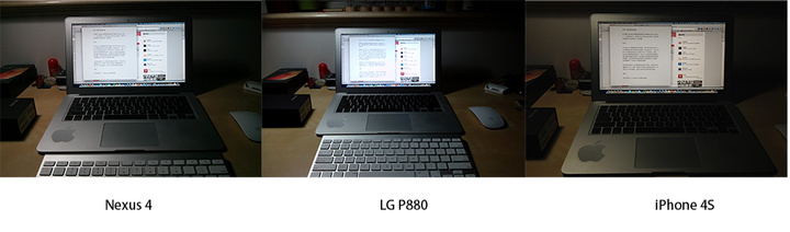 Nexus 4 机身背面搭载一枚 800 万像素背照式摄像头,表现尚可。整体成像色彩偏素;桌面台灯环境下自动档表现处于 800 万像素手机群的中上水平,个人感觉略好于 iPhone 4S。