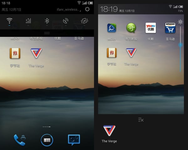 - 通知栏:尽管快捷开关还是不能自定义,但魅族在这个五个位置上已经做出了比较合适的选择:WiFi,数据,蓝牙,定位,屏幕旋转(以前是同步,后来去掉了)。WiFi 选择栏旁边加上了“设置”的快速入口,很方便。另外,通知栏已经可以全局唤出。