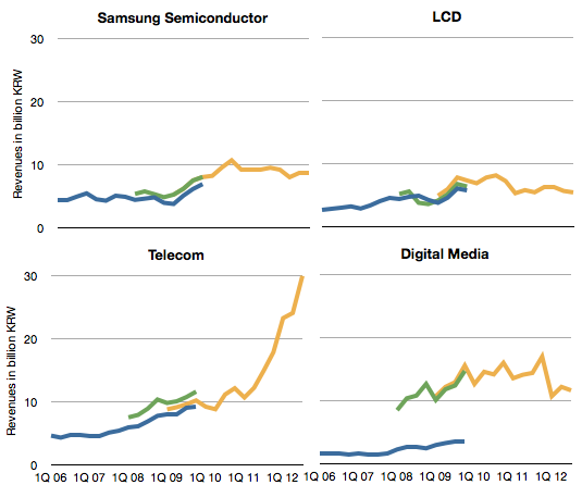 图七展示了三星各个部门的收入增长,其中电信部门成为收入的主力(Asymco 在该图中采用了三种不同的统计方式,蓝线表示母公司数据、绿线表示综合数据、黄线则表示基于 K-IFRS):