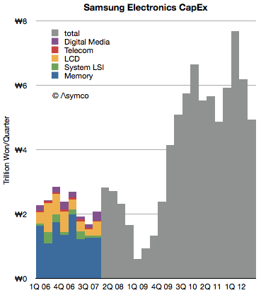 如何找到三星的投资结构?Asymco 回顾了三星历年个季度的资本支出,得到图四: