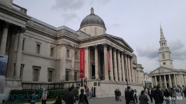 照片对比我不做评价,请自己去 Engadget 看。这些照片有点奇怪,有几张被拍的很模糊,而且没有夜景,这正是手机拍照最欠缺的地方。抛开照片的细节,N8 和 iPhone 4 在色调上有着根本性的差异,iPhone 4 的照片色调更暖,以英国国家美术馆的那组照片为例: