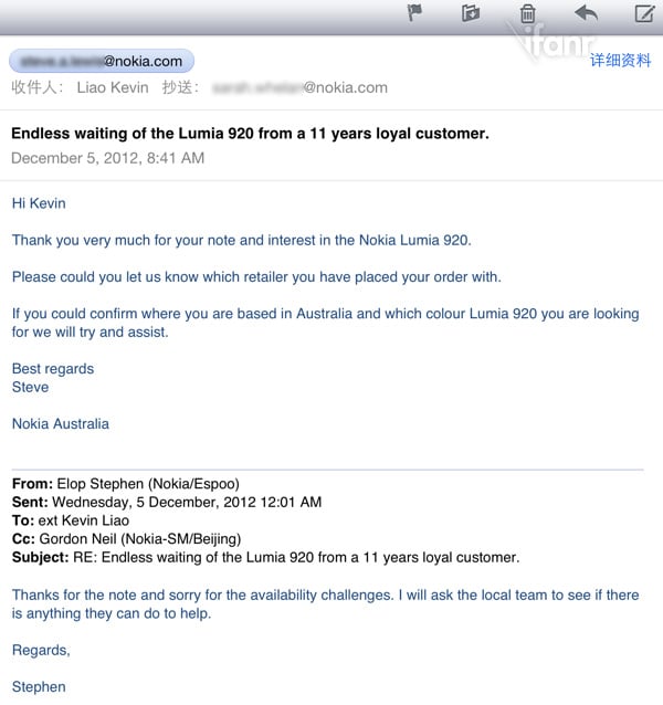 在 Elop 转发我的邮件之后的大约 3 个小时,也就是澳洲东部当地时间早上 8 点多(澳洲一般的上班时间是早上 9 点),我收到了来自 Nokia 澳洲总部的来信,他们在信中非常礼貌的对于我的意见表示了感谢,并询问我需要多少部 Lumia 920 以及我对颜色需求。我很快做了回复。