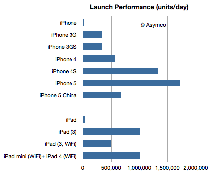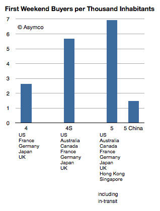 Asymco 的 Horace Dediu 则继续以往的风格,通过图表对 iPhone 5 的销量进行分析。下图显示了苹果各代产品首周末销量对比。Dediu 还指出,这是苹果第一次透露单个地区的首周末销量。
