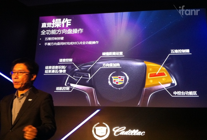 凯迪拉克方面介绍,方向盘控制 CUE 的理念是“手不离方向盘”,这是为了安全保障——另一个尝试是采用 HUD 方向将投射油耗、时速信息投递到挡风玻璃上,让司机专注与视线前方。上图右侧黄色区域是中控区功能键,可以控制播放音乐、音乐快进/停止等;红色凸起部分是五向控制键,可以上下左右和按压等。