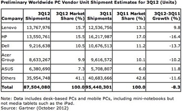 2012 年第三季度全球 PC 市场份额变化趋势