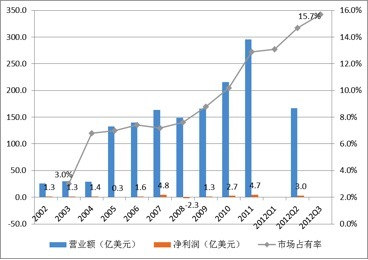 2002-2012 年联想营业收入、净利润及市场份额变化趋势(数据来源:Gartner、IDC、联想财报)
