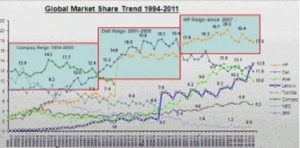 PC 市场策略中的价格战、渠道战、供应链战、多品牌战已被冠军们用遍,联想这次战略缺乏新意,多品牌战略也没有成功的先例。自 PC 诞生以来,冠军宝座上的主人已发生三次更迭,每个朝代经历 5~7 年。1993~2000 年,依靠克隆跃上冠军宝座的 Compaq,市场份额最高未超过 15%;2001~2006 年,依靠直销超越 Compaq 的 Dell,市场份额最高未超过 18%;2007~2012 年,依靠渠道和供应链获胜的 HP,市场份额最高达 20%,当然不能忘记收购 Compaq 的市场贡献。