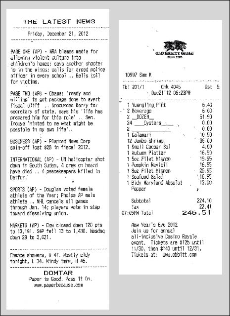 利用账单纸印刷新闻,现在已经不仅仅是英国工作室 BERG 所独有的想法。美国首府华盛顿最老的一家餐厅 Old Ebbitt Grill 最近的账单也变得特殊,正面印着正常的报价,而背面则印有一份长度短小的,均由美联社提供的最新新闻。