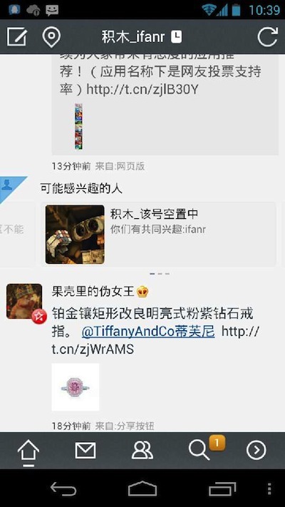 这是积木的截图。通过云云网搜索技术的支持,新浪微博客户端向他推荐了自己已经弃用的新浪微博账号——效果很糟糕,不光强制推送,还推送了用户毫不感兴趣的内容,已经不是算法强劲与否的问题。