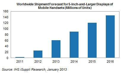 2013 年,平板手机(Phablet)的出货量将达到 6040 万部。2012 年,屏幕尺寸 5 英寸以上的智能手机出货量为 2560 万部。