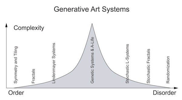 不仅如此,他还探寻了复杂理论与该艺术形式之间的联系——一般认为,复杂系统的“复杂”并非人们通常所指的复杂程度,而是指一个由多个简单单元所组成的结构,经过非线性交互作用,产生集体的行为。在加兰特尔看来,自动生成艺术本身就处于复杂理论的语境当中。艺术家们探索了高度有序的自动生成方式,以及完全无序的自动生成方式——这里包括遗传算法、常用于自动分形艺术的 L-System、涌现现象等等。