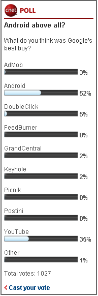 不知道读者对于 Google 近几年的收购案例如何评价?CNet 发起了一个投票,希望读者选出他们认为 Google 最成功的收购,暂时的投票结果如下: