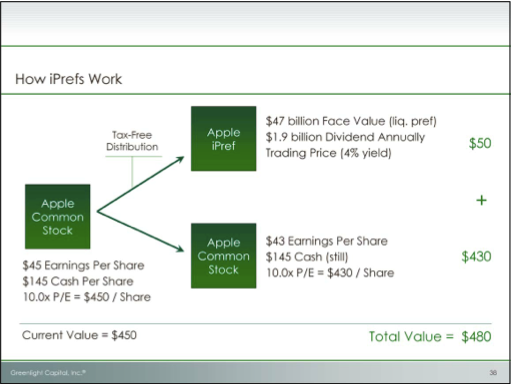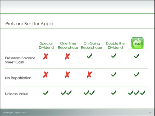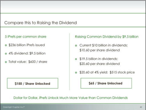 他提出了各种各样苹果为股东增加价值的方式,包括一次性派息等等,最终提出了名为“iPrefs”方案,这是一种每季度分派股息的方案,无限期。如下: