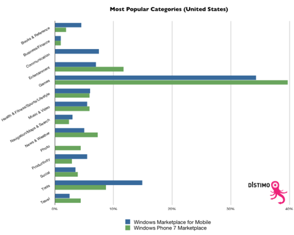 - Marketplace 里面属于 Windows Phone 7 的应用里面,游戏的比例明显要比 Windows Mobile (6.x)平台上面的比例高。这反映了 Windows Phone 7 一个更加以消费者为导向的平台。