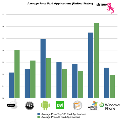 - Windows Phone 7 上最流行应用的价格也与其它平台上的价格一致:在 100 款最受欢迎的应用里面有 57% 应用的价格是低于 2.00 美元的。在其它平台上面,大致有 51% 到 67% 最受欢迎应用的价格也低于 2.00 美元。
