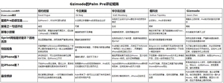 Pre评测中,华尔街日报的Walt Mossberg是使用“iPhone”一词次数最多的人——仅次于纽约时报的David Pogue(iFanr译文在此 )和今日美国的Ed Baig,他甚至还在讨论Pre之前,先发起了关于iPhone的讨论。所有的评测当中,瘾科技的Josh篇幅最长:一万字(原作者肯定没注意到Precentral的评测 ——iFanr注),Gizmodo的评测以3000字的篇幅位列第二。评测有很多共同点,也有观点不一致的地方:关于Sprint的服务和Pre紧凑的键盘。Jason Chen的比喻是其中最为恰当的,David Pogue也许可以与之相比。请继续阅读…