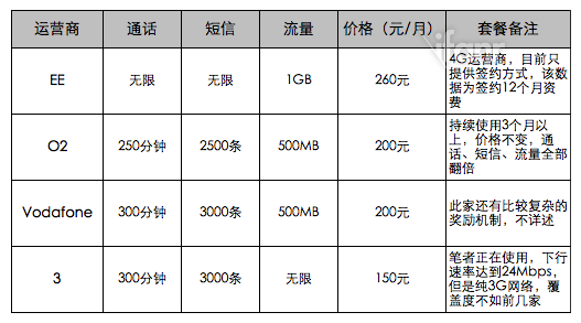 注:只给出能随时终止的消费方式(除了第一行的 4G 运营商 EE),实际签 18 个月或 2 年、3 年的合约更便宜。