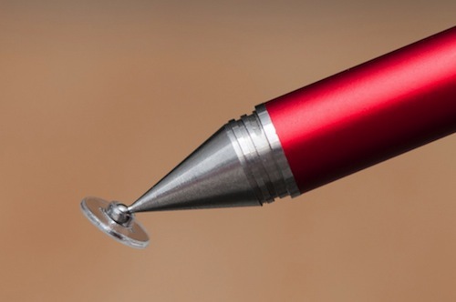 首先,我们来看看它的设计——笔尖没有采用现在触控笔常用的橡胶材质,很类似现实中的原子笔,笔尖的最前端会收窄为一个球体,不会阻档视线;球体外套了一个圆碟,可自由地以各种各样的角度倾斜,换言之,我们在写字的时候担心自己姿势不对的问题。
