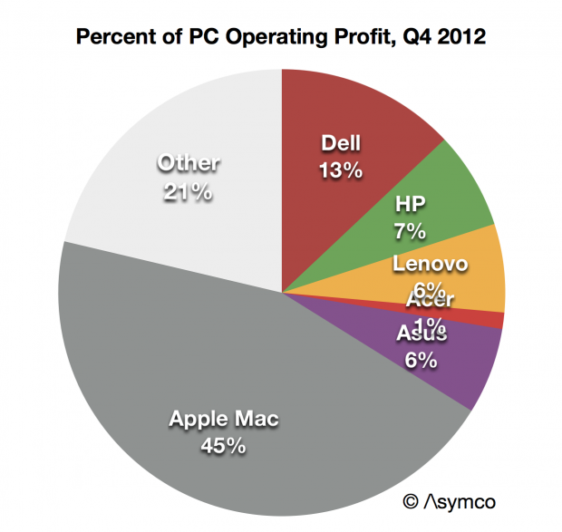 而且回到 PC 产业运营利润话题——所有 PC 厂商的痛楚——形势不容乐观。根据 Horace Dediu 预测数据,如果把苹果的 Mac 归属到 PC 类别,那么主流的五大厂商盈利率(profitability ratio)加起来都没有苹果一家大(45%)。PC 产业在利润不振,操作系统不济,对新硬件望眼欲穿情况下,准备如何迎接平板时代的挑战?