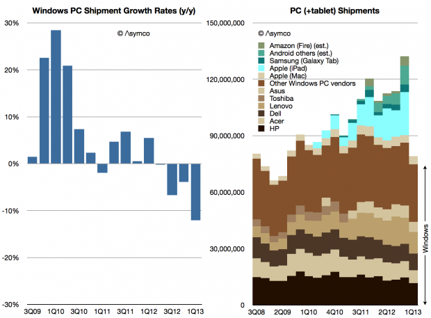 根据 Asymco 创始人 Horace Dediu 统计的数据,全球 Windows PC 销量持续下降,并有加速的趋势(下图右);相比之下,iPad 和廉价 Android 平板越来越受欢迎。在移动化浪潮下,英特尔能否单靠 Haswell 一种产品力挽狂澜存在疑问。