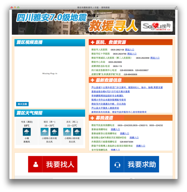 这张图片是搜狗提供的寻人平台。请注意,在纵高为 1080 像素的屏幕上才刚好可以看到“我要寻人”的按钮,更不用提 Flash 播放器里的电视节目发出的噪音,以及右边主要为带给自己网站更多的流量而设计的新闻标题链接,它们只能分散用户的注意力。在危机面前,人的通常反应是更加慌张的,这些无疑对于真正的目标用户来说是求助的 blocker。