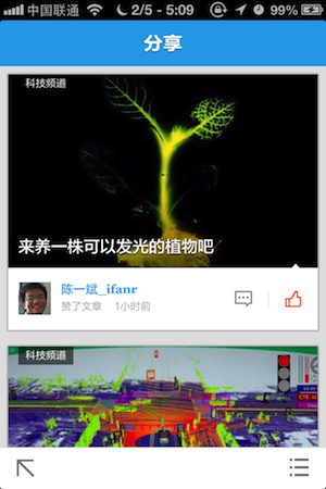 ZAKER 的分享界面里的信息流采用了卡片式的设计,题图和标题构成了改卡片的基本元素。经过测试,一般来说,无论是我们“赞”了哪篇文章,还是评论了哪篇文章,都会分享出去。