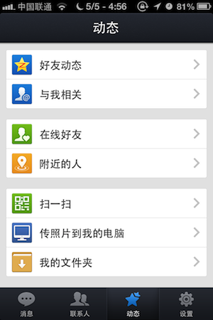 被取消的 Tab 是“发现”,不光我和我身边的朋友,相信基本没人注意它,因为它完全与聊天无关。现在,“发现”的里大部分内容已经放在“动态”里。实际上,Android 版的QQ 手机版 已经是 4 个 Tab,现在只不过是将两者统一起来。