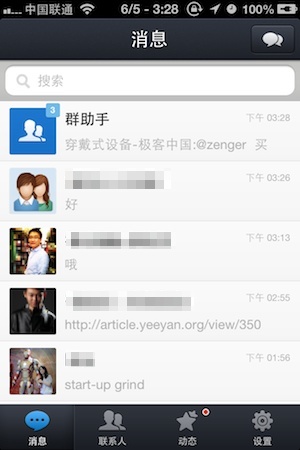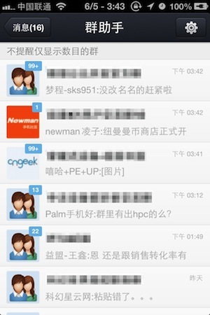 除此之外,我们还可以看到“消息”窗口中,多了“群助手”。它的作用是管理那些屏蔽了消息的群,既不至于埋没里面的消息,又不让人心烦,相当于多了收纳杂碎的盒子。