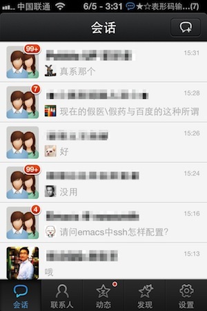 以往QQ 手机版 的搜索栏放在“联系人”窗口的顶部,如今则移到“会话”的顶部。这一改动更加符合移动聊天时的场景——实际上,日常的聊天对象基本上是固定的,无非就是同事、朋友、亲戚、家庭,甚至聊天对象也是相对固定的。这一事实决定了,我们很少翻看联系人列表。