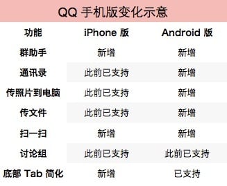附:由于 iPhone 版和 Android 版的 QQ 手机版新增功能点有所不同,我整理了一份图表——
