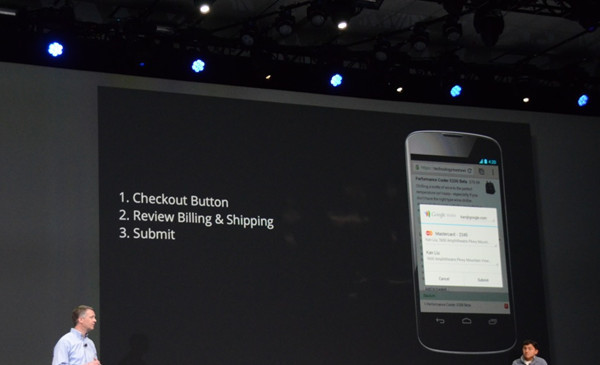 Chrome 简化了网络购买的流程。厄普森演示了一般人在移动版 Chrome 上购物的流程,从点击“购买”按钮开始再到确认购买,足足有 21 个步骤。于是,新的 Chrome 通过 HTML5 里“自动完成”(autocomplete )特性来简化移动购物的步骤。现在,移动购物只要三步:点击购买按钮,查看订单以及发货,然后确认。
