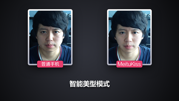 此外,MeituKiss 的前置摄像头还能自动测光,如果人处于比较暗的环境下,软件会自动调整,至少将照片拍出来。MeituKiss 还具备“实时美颜预览”的功能,在自拍之前,找到适合自己的最佳效果——而且还能将胖脸变成瘦脸,等等。