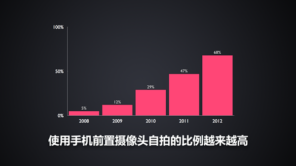 吴欣鸿登上舞台后,说他发现美图秀秀的用户里,喜爱自拍的用户比例越来越高,从 2008 年的 5% 升至 68%——当然,后期美图秀秀也变为一款偏向于处理“自拍照”的工具。吴欣鸿和蔡文胜的观点是一致的,图片成为沟通的主要手段。