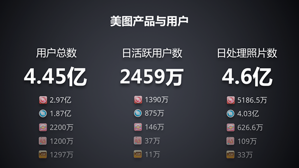 - 用户总数 4.45 亿,其中美图秀秀本身的用户数达 2.97 亿;