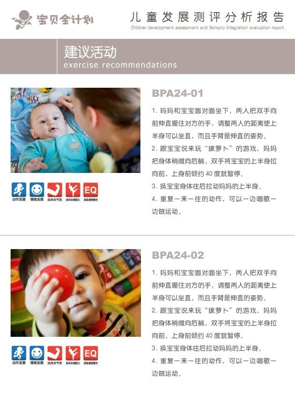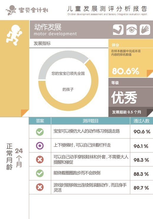 而宝贝全计划也不光提供了训练项目,针对不同发展阶段的宝贝,它还会提供专业的测试,等家长做完评测,并如实填写了答案之后,就会有一份报表,方便家长了解自己宝贝的发展情况。报表中还会针对宝贝发展较慢的方面给出建议,并对宝贝的训练计划进行相应的调整。