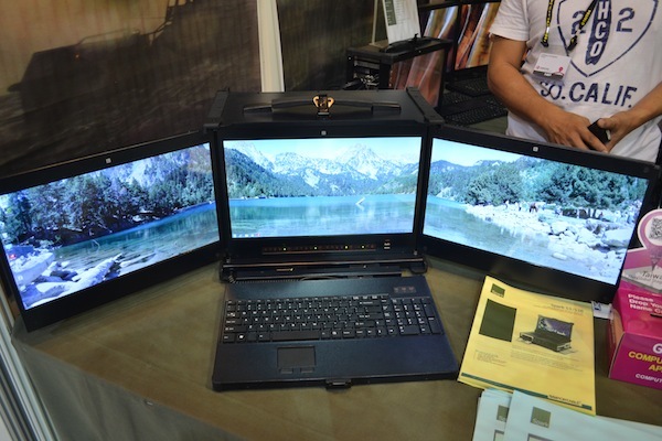 在世贸南港馆的一层,我首先看到的是搭配了三个屏幕的便携式台式机 Spark S9T,看到上面的图片我们就知道,它的其实就是一个机箱然后加上了三块屏幕,再将鼠标和键盘也集成到一起,重量足足有 15 公斤。这么奇葩的机子有市场吗?