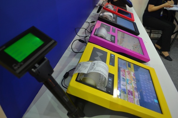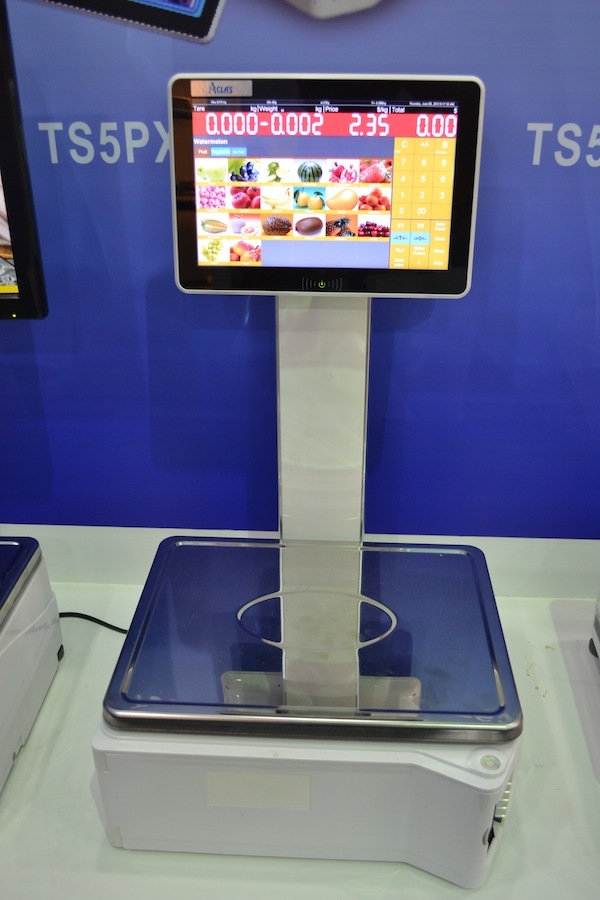 我发现收款机在电脑展中也占领了一部分的摊位。今年所看到的新型收款机都配备了彩色的触摸屏,触摸已经成为趋势。而我路过 ACLAS 的摊位时,发现它不仅制造收款机,还制造带彩色触摸屏的电子秤 TS2X/TS5X