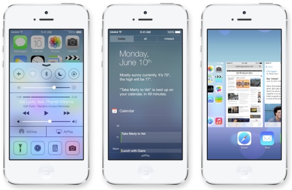全新的界面设计让人眼前一亮,颠覆了之前一贯的设计风格,堪称 iOS 诞生以来最为激进的变化。正如之前传言所说,新的 iOS 界面设计更贴近“扁平化”,去除了大量拟物设计的纹理等元素。整个系统的外观、所有的内置应用、图标都经过了重新设计。新的系统字体更加细瘦,按钮、列表、标签在视觉上全部做了简化。新的色彩方案整体风格明亮鲜艳,和安卓原生的黑色主基调的深沉风格形成强烈对比。发布会上 Craig Federighi 在介绍 OSX 的新日历应用时,对拟物化设计大加嘲讽,多少有些过河拆桥的意味。