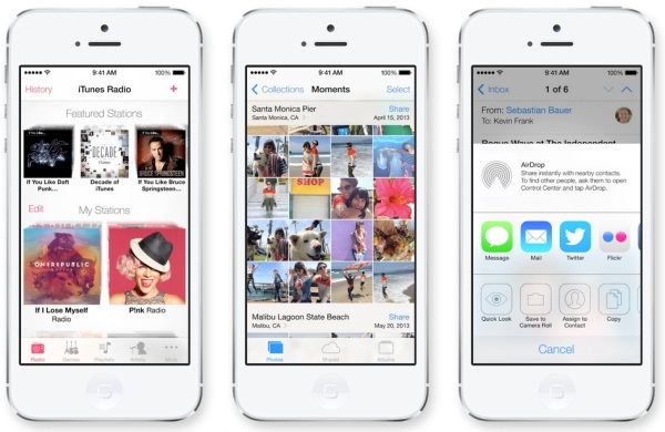 新的相机应用使用手势操作可以快速在拍照、摄像、全景拍摄等不同模式下切换,并内置了一系列滤镜供用户使用。相册应用中也增加了多种方式来浏览相片,和桌面版的 iPhoto 类似。另外,除了图片以外,视频也可以通过 iCloud 共享了。